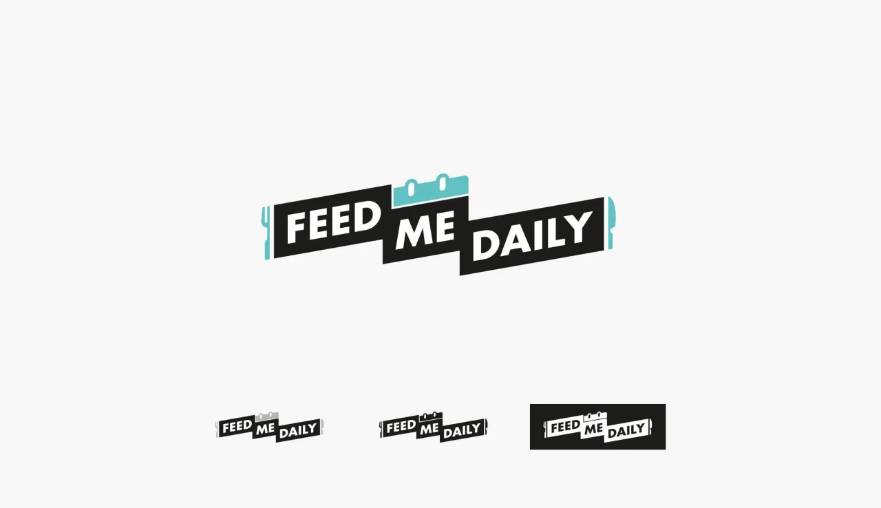 We designed a logo around the inherent geometry of the name itself: three staggered banner forms that stack and shift like a meal being plated. The teal calendar icon embedded at the top — the "daily" in Feed Me Daily — locks in the brand's routine-focused identity, while the fork and knife cutouts anchoring each end make the food connection unmistakable.
